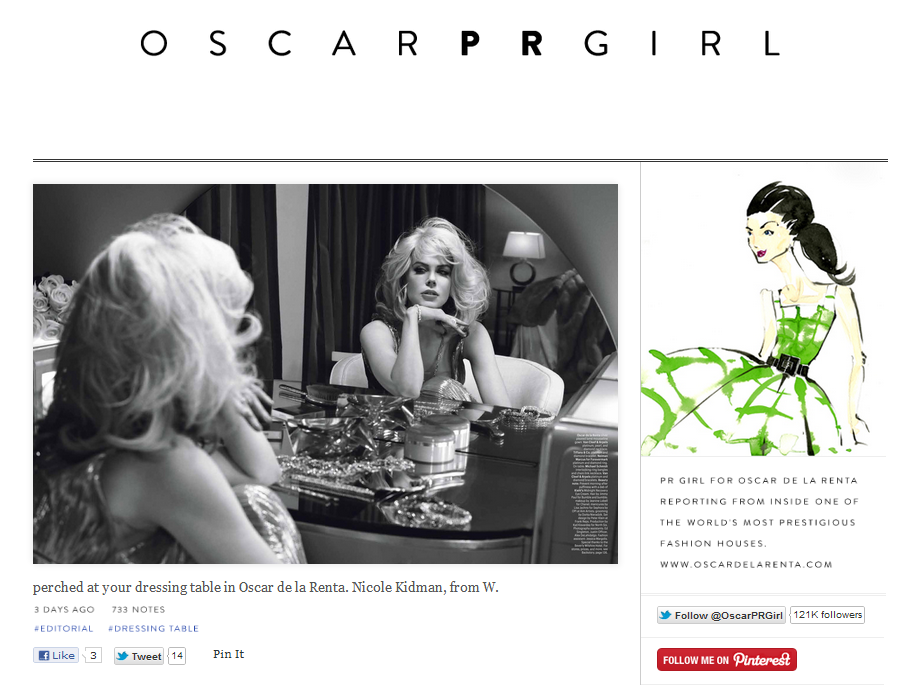 Establishing a personal relationship with followers has been the brand’s social media strategy. A blog called George & Ruby launched last month Oscar de la Renta’s latest endeavor, centered around the children’s wear collection. The blog is written by Marissa Kraxberger, head of the company’s creative team. “It’s a demographic that we didn’t think made sense for me to speak to,” Bearman said, calling George & Ruby a personal account of Kraxberger’s life as a working mother of two. “I don’t have kids and we didn’t think it was realistic for our fans to hear about children’s clothing from OscarPRGirl.”